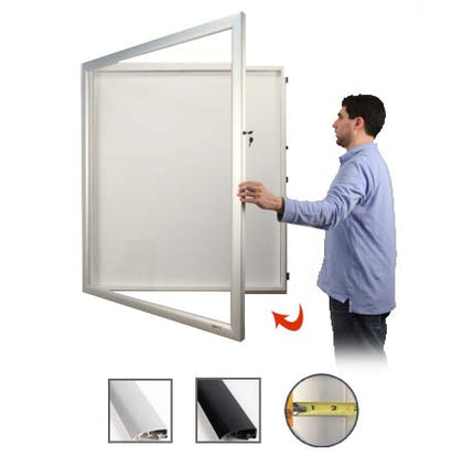 When the Super Wide Face is wall mounted, you can't tell that the shadow box frame swings open. But if a lock with a key is required, we can install a side plunge lock as an option. Also, the viewing window is break-resistant acrylic made with clear Lexan Polycarbonate.