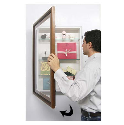 SwingFrame Designer Display Cases with wood shelves feature concealed hinges and a sliding gravity lock discreetly placed behind the wood frame in the 353 profile. When mounted on the wall, the display case's wood frame swings open without being noticeable. This patented design sets our display cases apart, providing an 8-inch deep SwingFrame wall display with shelves that offers a clean, contemporary appearance without the distraction of exposed hinges and locks on the front.
